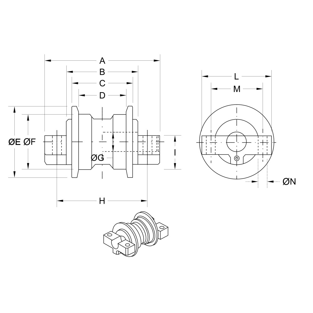 - Фланець (випуск) – Один фланець, розташований з одного боку ролика, який утримує гусеницю на правильному шляху. Захищає гусениці від зсування з ролика.